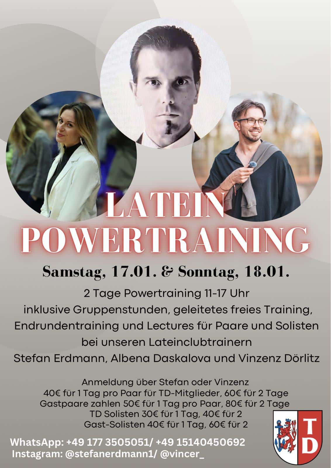 Latein POWERTRAINING Samstag, 17.01. & Sonntag, 18.01.2026 jeweils von 11-17 Uhr Inklusive Gruppenstunden, geleitetes freies Training, Endrundentraining und Lecture für Paare und Solist*innen bei unseren Lateinclubtrainern Stefan Erdmann, Albena Daskalova […]