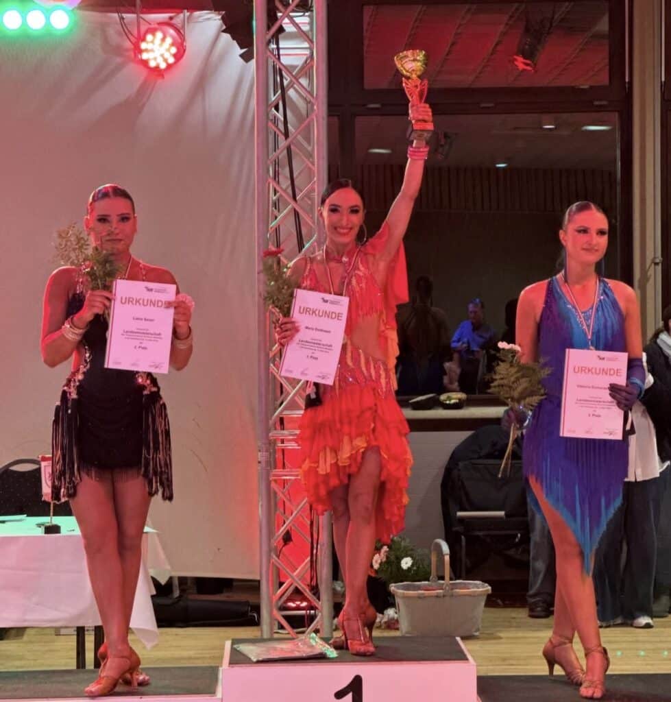 Für weitere Erfolge sorgten die Solotänzerinnen der A-Klasse: In der HGR A Latein Solo tanzte sich Maria Dortmann souverän zum Landesmeistertitel und sicherte sich Platz 1. Komplettiert wurde der Erfolg durch Liana Sauer, die mit dem 2. Platz Vizelandesmeisterin wurde. Barbara Schicktanz erreichte Platz 4, Olivia Steinhauer Platz 7.